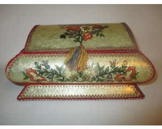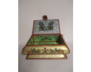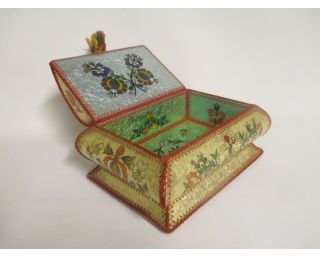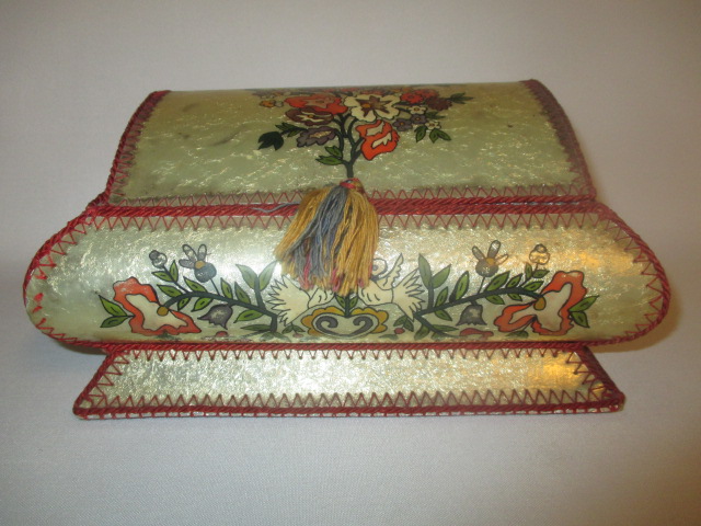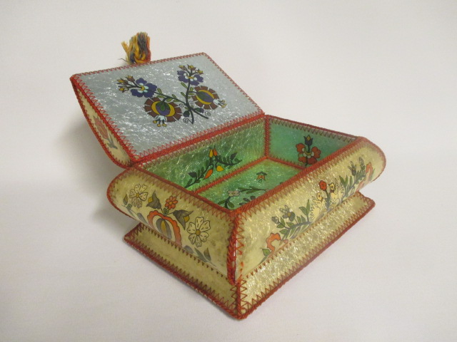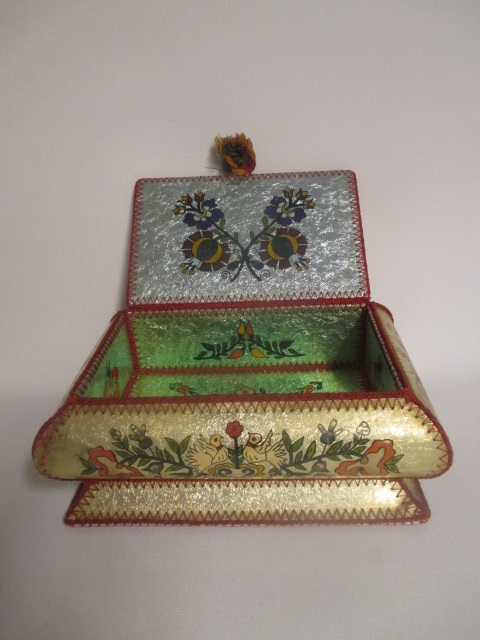 Opravdu nádherná šperkovnice, že by z Východu? Vypadá to na Rusko, Ukrajinu nebo bývalou Jugoslávii. Zdobeno různými barvami. Šperkovnice stojí na 4 podložkách, bohužel jedna chybí.