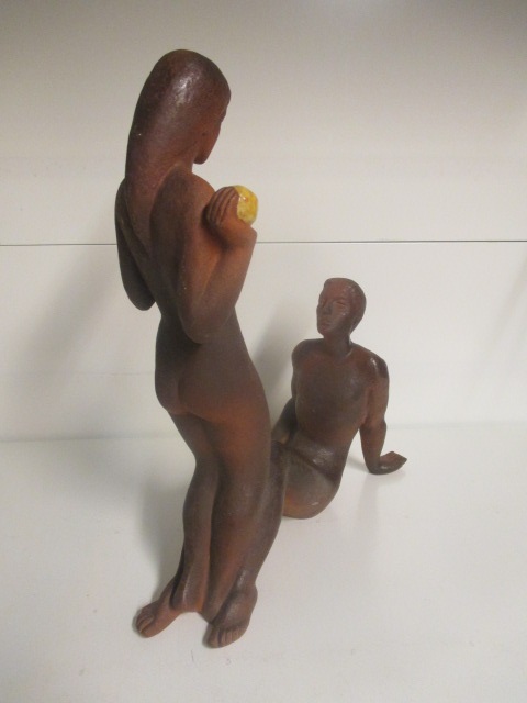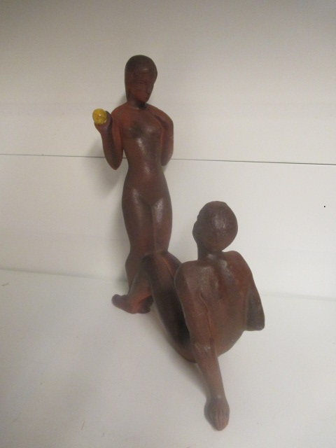 Socha/soška Adam a Eva s jablkem vyrobena z keramiky. Sousoší jak takové není glazováno, kromě zlatého jablka, které je glazováno žlutou vypalovanou barvou.