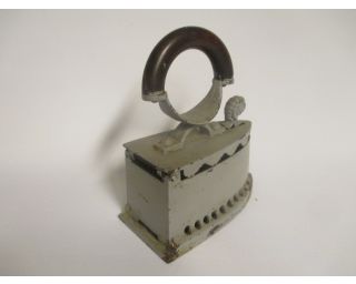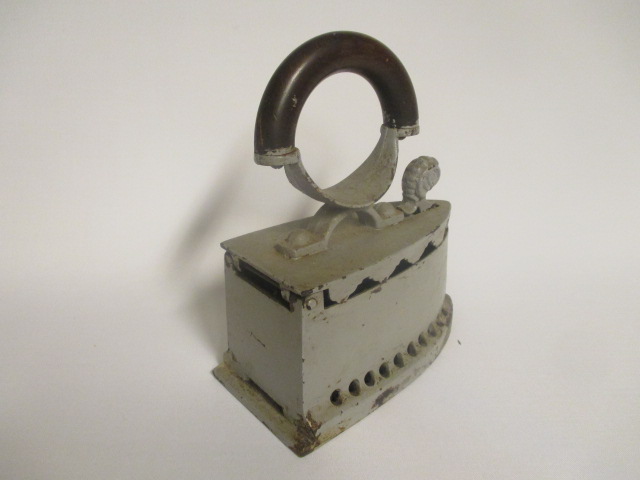 Stará žehlička, dřevěná rukojeť, Na některých místech je oloupaná šedá barva, těžko říct, zda je původní.