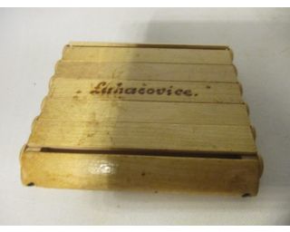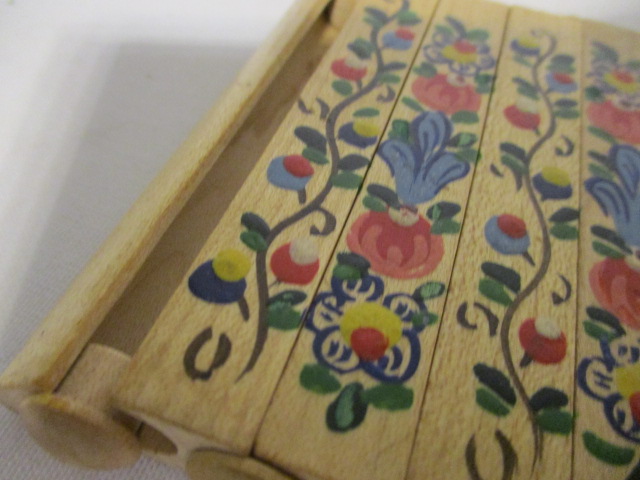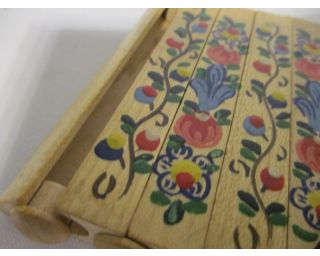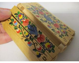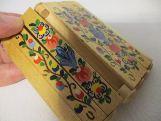 Tabatěrka, zásobník na cigarety, Luhačovice - jedná se o tabatěrku ze dřeva, zásobník je na 6 cigaret, rozměry: 9 x 10 cm, krásně malovaná-lidový vzor na jedné straně, na straně druhé napsáno Luhačovice, velmi zajímavé i vydělávání cigaret z pouzdra ,stáří přibližně 80 let