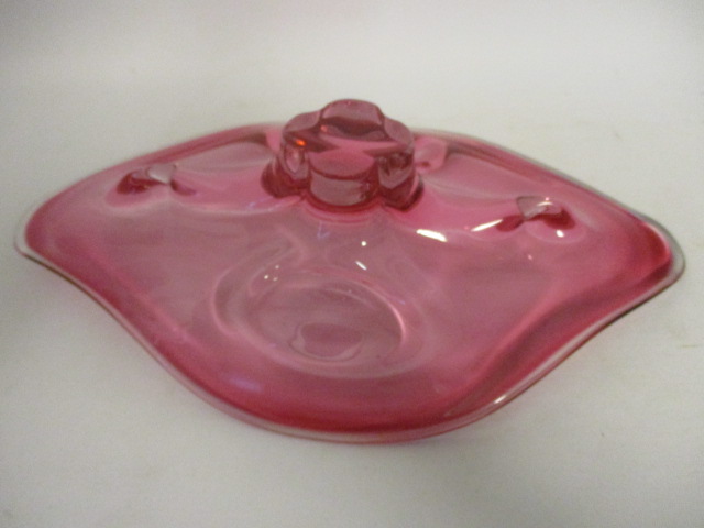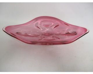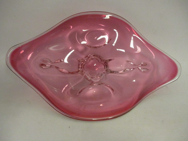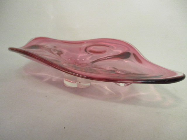 Mísa, růžové hutní sklo, mísa na nožce - velmi zajímavý tvar - délka 37 cm, šířka 22 cm, výška 8 cm - bez viditelného poškození - opravdu moc krásná, zajímavá...