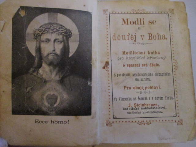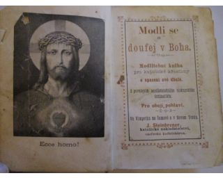 Modlitební knížka pro obojí pohlaví - rok vydání neuveden, počet stran 385, vydalo katolické nakladatelství J. Steinbrener, poškozen zámek, u 8 stránek ustřižen rožek vpravo nahoře, hřbet se začíná uvolňovat, ale knížka má nádherné zdobení 3D, rozměry: 8,5 x 11,5cm v původní dárkové krabičce