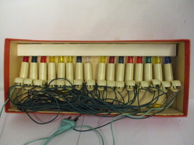 Retro světýlka na stromeček, vánoční osvětlení - 16 svítících světýlek + 3 náhradní. Velmi málo používané, jasné syté barvy, v původní krabici. Rok výroby 1977. Výrobce ZLATOKOV Piešťany.