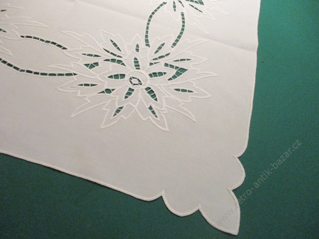 Vyšívaný ubrus, retro ubrus, čtverec. Bílá výšivka na bílém plátně. Rozměry: 65x70cm.