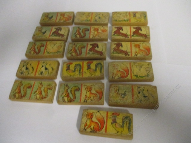 DOMINO, stará společenská hra, retro dřevěná hračka - zvířátkové staré domino. 16 kusů. Rozměr domina: 3,5 x 7,5 cm. Bez krabice. Stav - viz foto.
