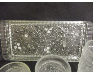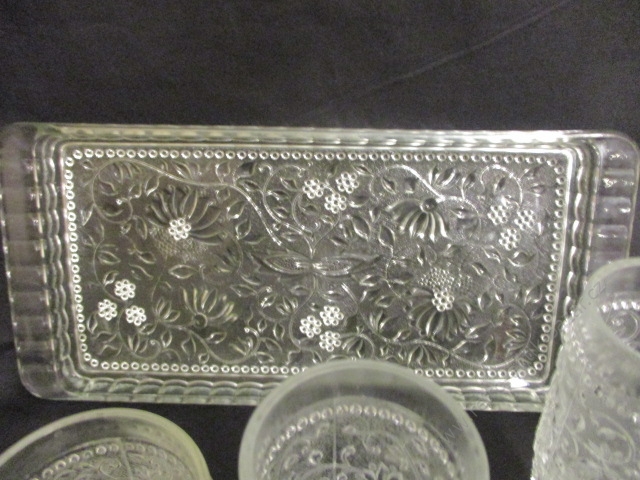 Grogovka - velká sada 13 kusů. Silnostěnné retro sklo. Tác má rozměry: 34 x 16 cm. Jedna sada, 6 kusů: výška 11,5, průměr 7 cm. Druhá sada, 6 kusů: výška 15, průměr 5,5 cm. Stejný vzor na sklenicích i na tácu. Bez poškození. Nádherná velká retro sada.