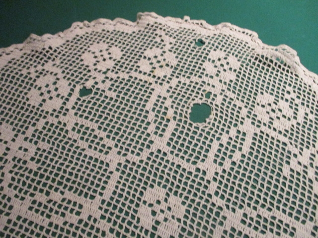 Háčkovaná stará krásná dečka na opravu, průměr 60 cm. Bílá. Poškození vyfoceno.