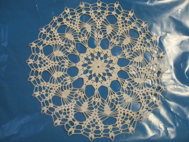 Háčkovaná dečka, průměr 30 cm. Bílá barva. Ruční práce.