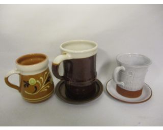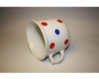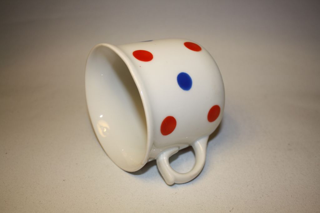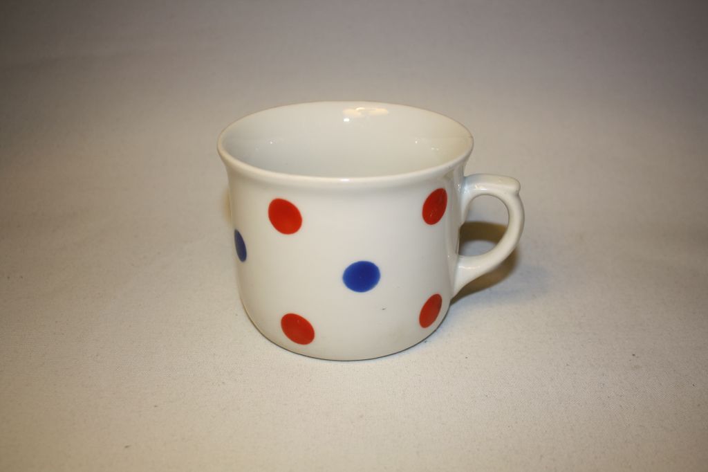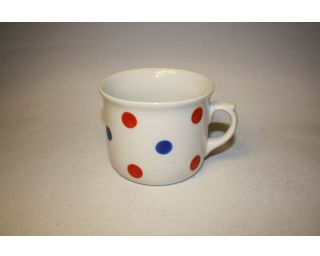 Zachovalý RETRO hrnek s modročervenými puntíky bez značení. Výška 9 cm, průměr 11 cm.