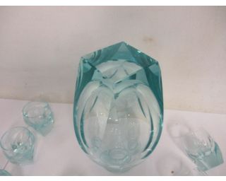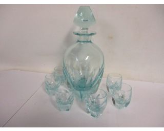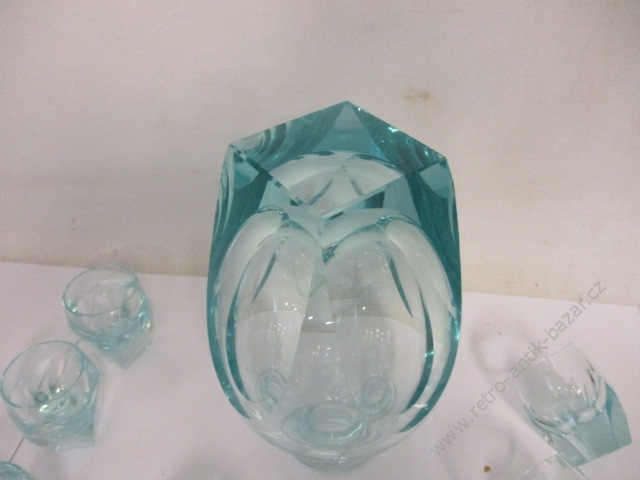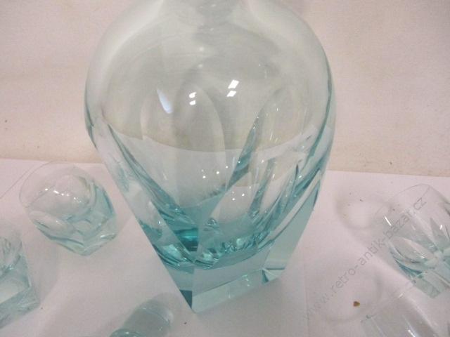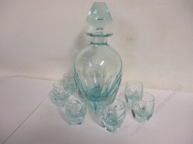 Karafa + 6 skleniček, retro souprava, silnostěnné sklo - karafa má velikost 17,5 cm, + víko 23 cm. Nádherný tvar, bez poškození. Štamprle mají velikost 5,5 cm. Namodralá barva. Tři skleničky mají malinkaté oťuky.