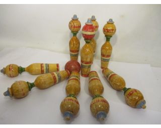 Kuželky - retro hračka, hračka ze dřeva - 9 kusů kuželek o velikosti 15,5 cm + koule o průměru 5 cm - stav viz foto