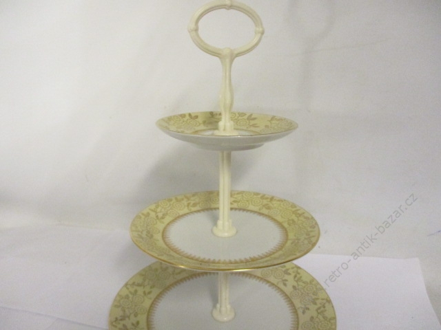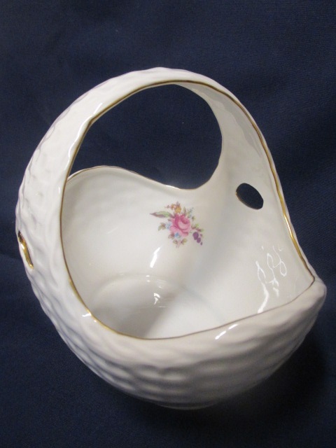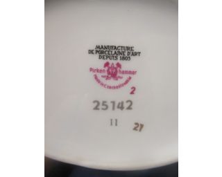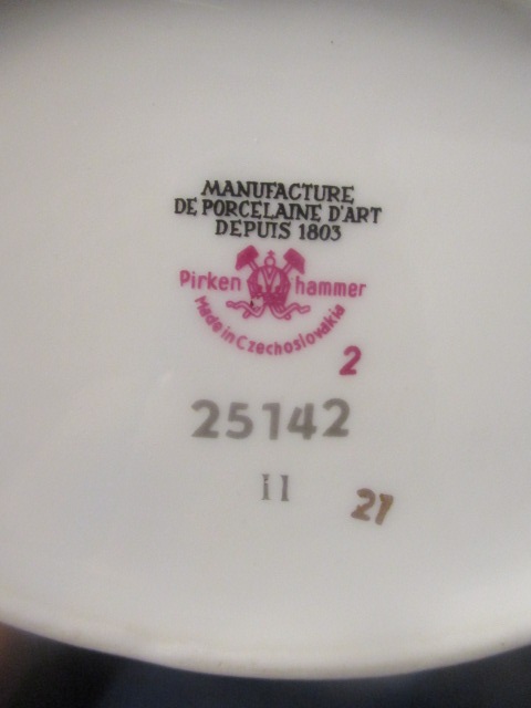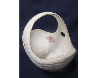 Porcelánový košík značen československou porcelánkou Pirken Hammer. Porcelánový košík je decentně zdoben zlatým proužkem a květy uvnitř košíku. Košík je navíc zdoben imitací proutí.