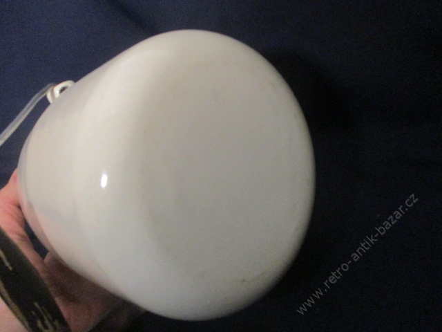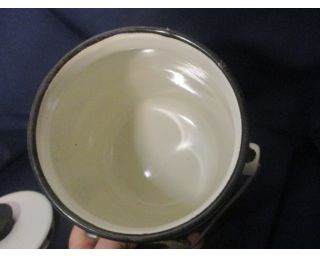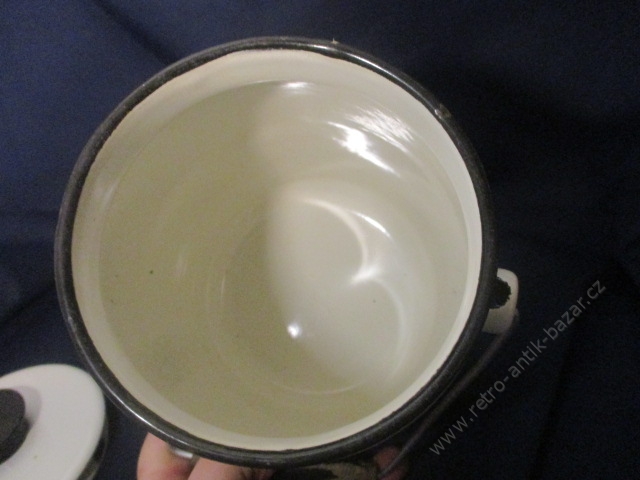 Plechová bílá konvička. Celková velikost 23 cm, bez víka 19. Pěkný stav.