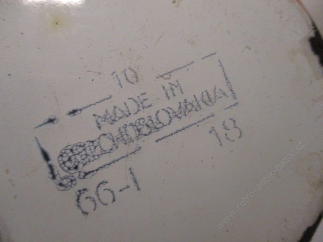 Plechová mísa s barevným motivem, ČSSR. Velikost 10 cm, průměr 19. Používaná, oblíbená, ale pořád nepřehlédnutelná a funkční.