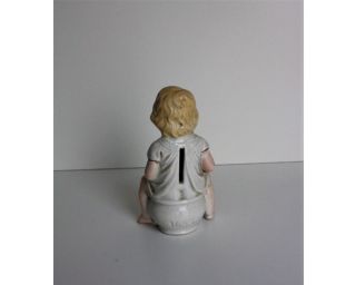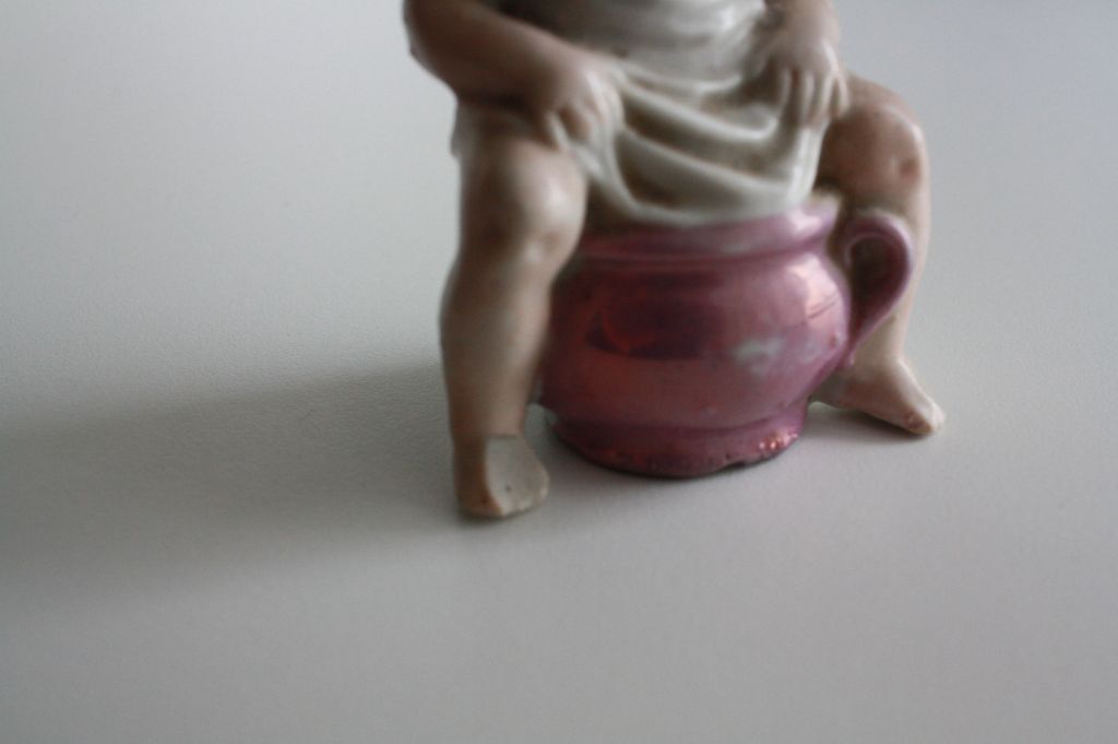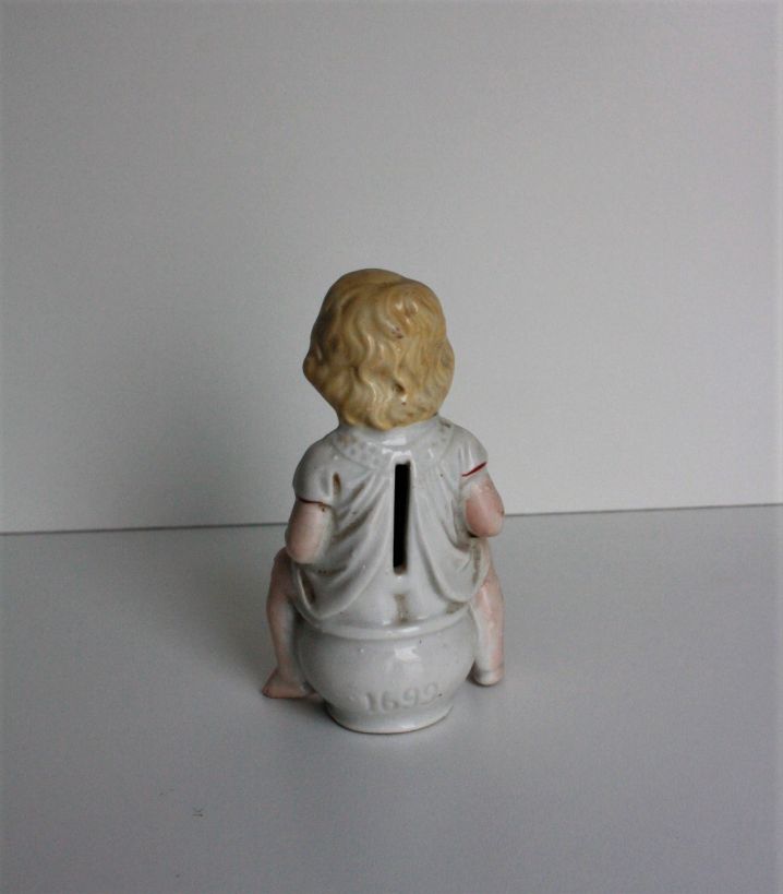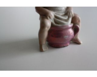 Pokladnička sedící dítě na hrnci. Ze zadní strany sošky je číslovka 1699.