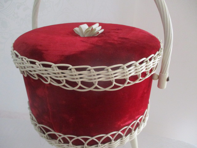 Retro košík na šití na nožkách - celková výška 48cm, velikost košíku 22 cm, průměr 32 cm, košík tmavě červené barvy, semiš, uvnitř tenká přepážka na drobné věci, velmi krásný bytový retro doplněk