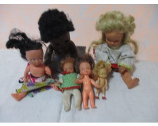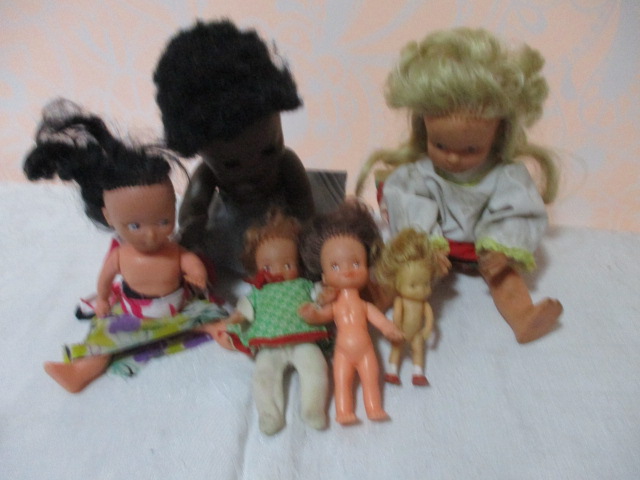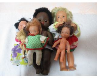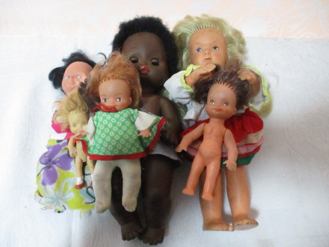 Retro panenka, stará hračka, sběratelství - 6 kusů - Velikosti: 9, 13, 14, 20, černoška 27cm a mrkací panenka 26cm. Nálezový stav.