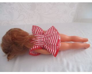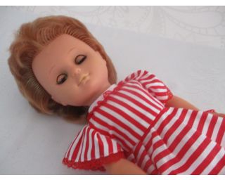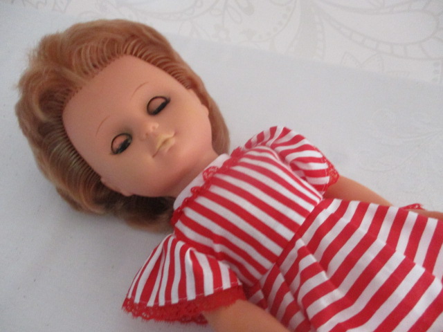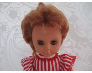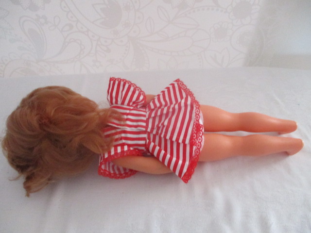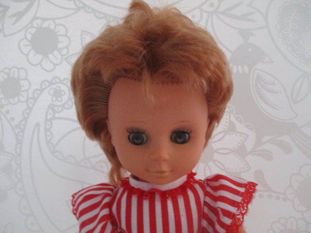 Retro panenka, stará panenka - velikost 44cm, mrkačka, tmavší blond vlásky, původní oblečení, dobrý stav, pouze na pravé ruce dva zelené pruhy - vyfoceno