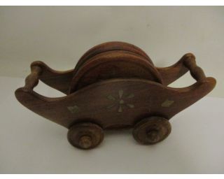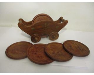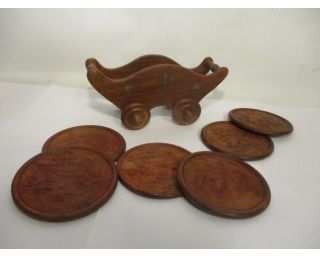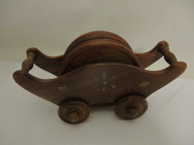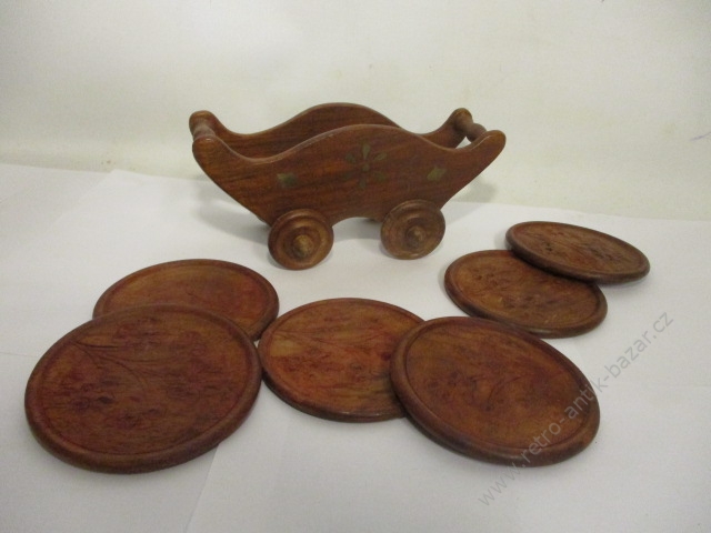 Retro vozíček s podtácky - ze dřeva, vozíček má délku 18, vysoký je 9 cm, má 4 kolečka. Podtácků je šest o průměru 9 cm.