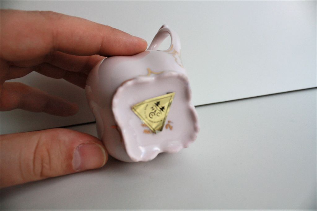 Růžový porcelán hrníček s podšálkem s drobným zlatým značením. Skvělý dekorační kousek, který může posloužit i jako hrníček pro kafe.