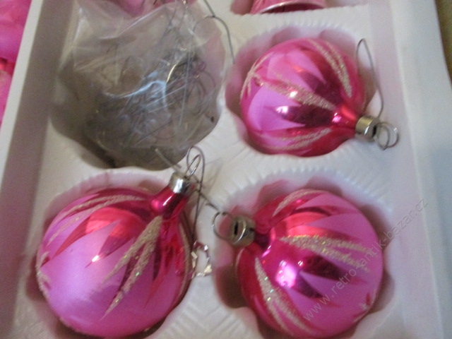 Skleněné baňky na vánoční stromeček, růžové baňky + špice, háčky, 19ks