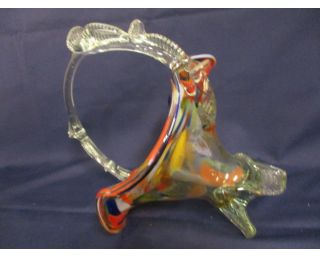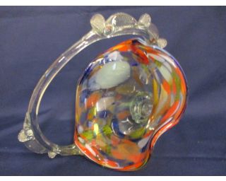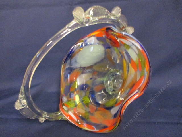 Skleněný košík, brokové sklo, retro sklo - velikost (s uchem) 30cm, bez ucha 16 cm, bez poškození, krásná práce českých sklářů
