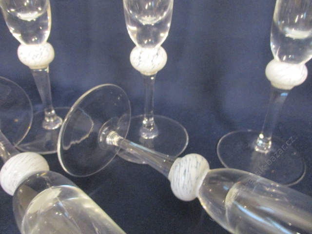 Skleničky, sklo na víno. Jedná se o šest kusů skleniček o velikosti 20,5 cm. Velmi krásné provedení, originální bílá skleněná koule na každé stopce.