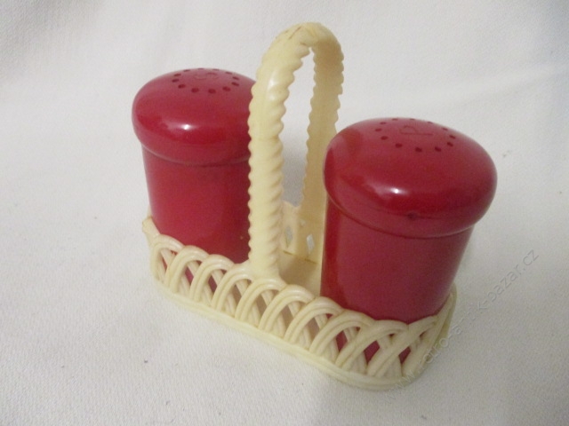 Solnička a pepřenka na stůl červené barvy. Prostě RETRO souprava na stůl. Velikost plastových dóziček je 6,5 cm, košíček má výšku 9,5, délku 10. Košíček nevydzžel používání a je prasklý na horní straně-vyfoceno. Jinak se jedná o klasickou retro soupravu. A krásnou...