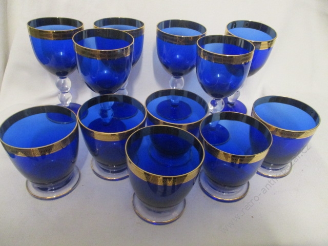 Stará sklenička, 6x sklenička, velmi zajímavý tvar i barva, sklenice. Velikost 6 cm, horní průměr je 5,5 cm. Barva světle modrá, zlatý okraj. Těžké dno, nádherný baculatý tvar. Velmi málo používané, bez poškození.