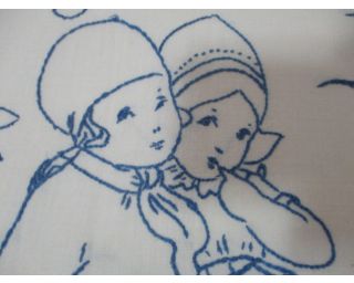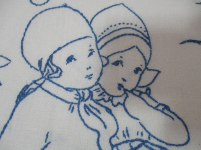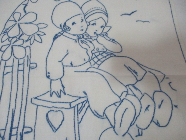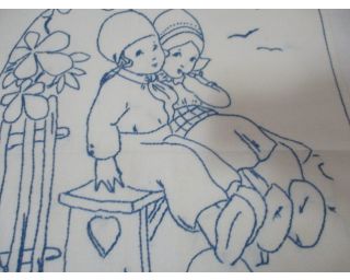 Stará výšivka - chlapeček a holčička na lavičce - rozměry: