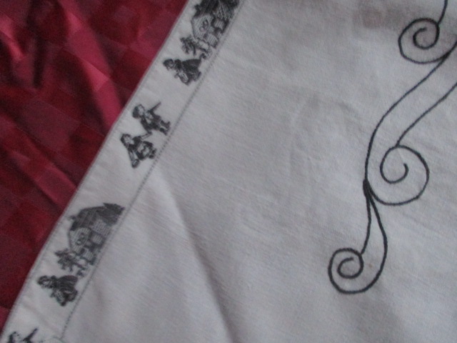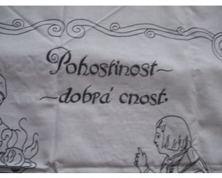 Stará výšivka na zeď, výšivka "Pohostinnost - dobrá cnost", vyšito pouze u slova pohostinnost jedno en, chyba či záměr?, jedná se o černou výšivku na bílém plátně, rozměry: 90x69cm, sem tam rezavý flíček, jedna malá oprava-zalátání dírečky, prostě používané, oblíbené, funkční