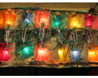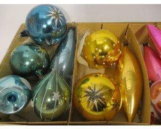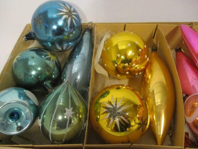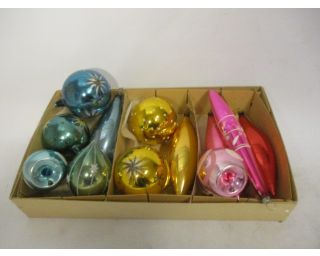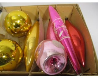 Staré velké retro baňky na stromeček - 12 kusů - jde o velké staré rozbitné ozdoby barvy: žluté, růžové a modré v původní krabici od ozdob