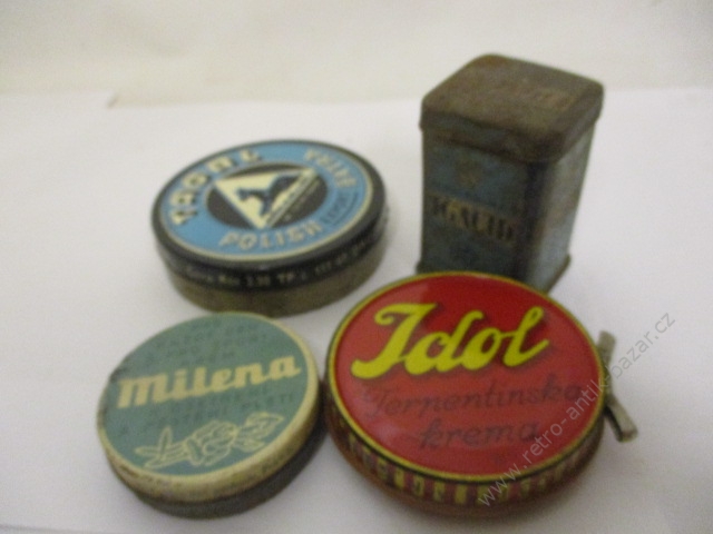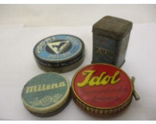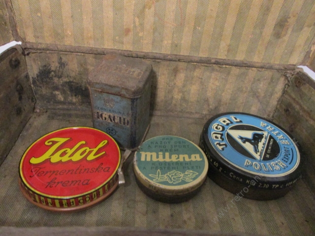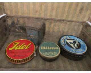 Starý kufřík + staré plechovky - IDOL, průměr 6,5cm MILENA průměr 5 cm, , TAGAL průměr 7,5 cm, IGACID velikost 6cm
