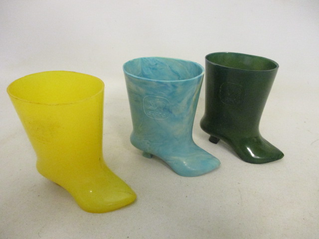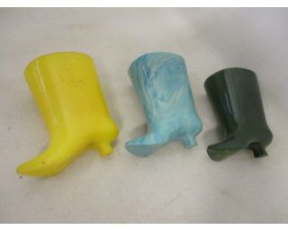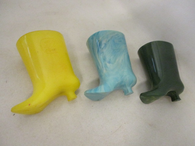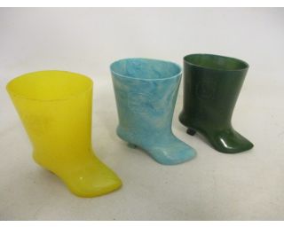 Tři reklamní botečky Svit. Zelená, žlutá a modrá žíhaná. Výška 10cm, hloubka 9cm. Dříve se používaly botečky jako stojánek na tužky. Na každé znak SVIT. Dobrý stav