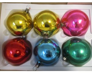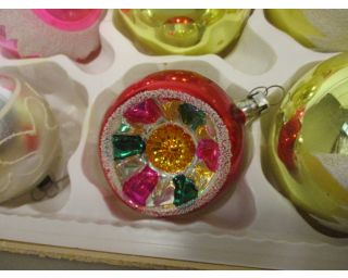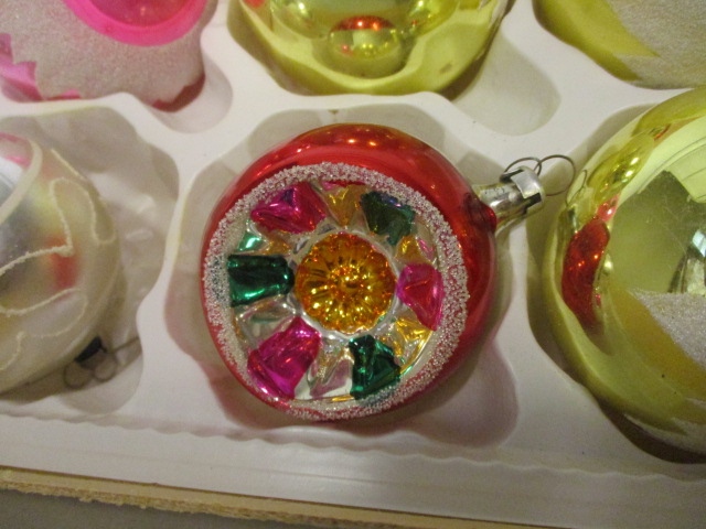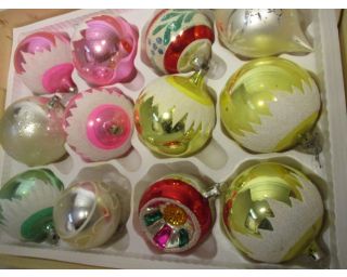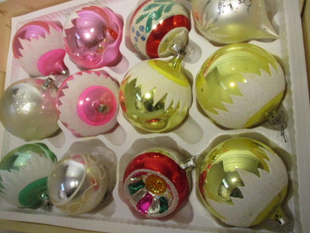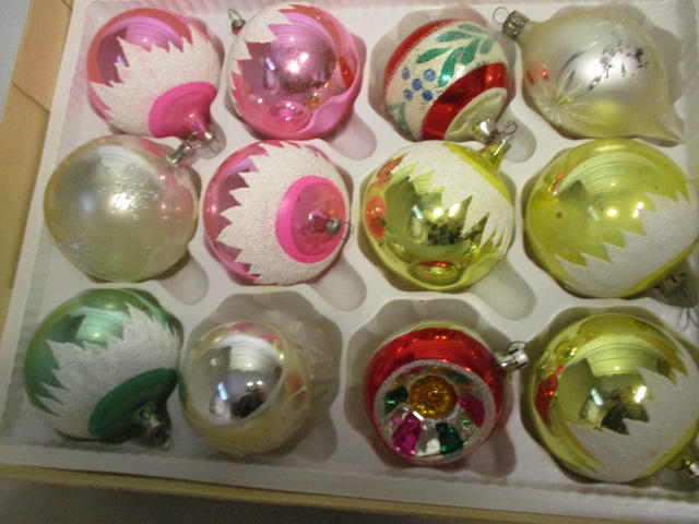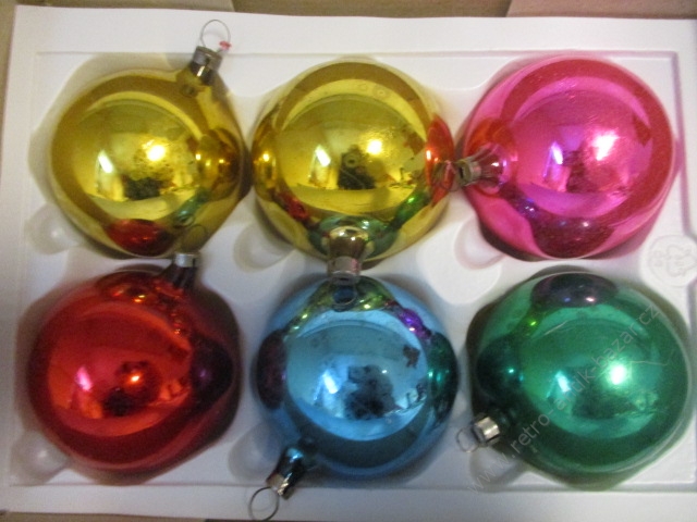 Vánoční baňky, ozdoby na stromeček, retro vánoce - 12 kusů baněk v původní krabici o rozměru: 25 x 32 cm - žlutá a růžová mají průměr 7 cm - udělej si retro vánoce....