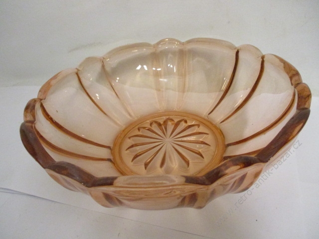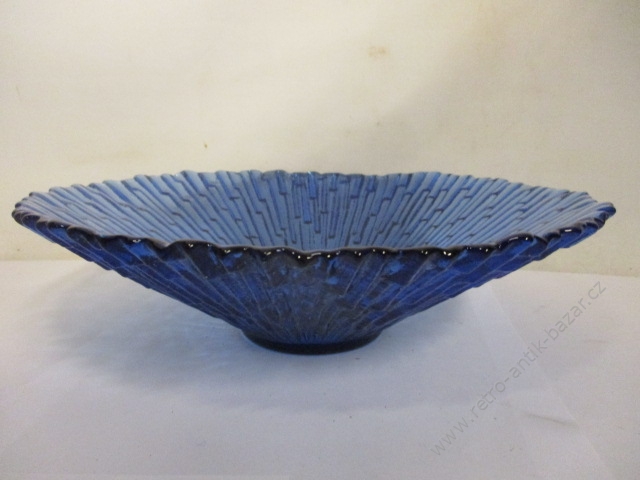 Velká mísa z hutního skla s oboustraným zúžením na stranách. Mísa je zajímavá nejen svou velkou velikostí, ale také svým zbarvením. Nejvíce převažuje sytá modrá barva, na obou zúženích se maličko vyskytuje bílá (průhledná) barva. Třetí barvu, červenou, nalezneme očima téměř skrytou, a to na samém podstavci.