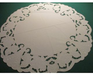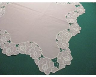 Vyšívaná dečka, ubrus, čtverec - 58x58cm. Jedná se o bílou výšivku na světlunko růžové látce. Krásná, jemná. Bez poškození.