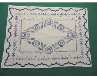 Vyšívaná dečka . Rozměry: 38 x 28 cm. Modrá výšivka na bílém plátně.