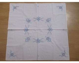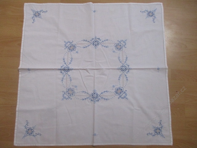 Vyšívaný ubrus, čtverec 84 x 84 cm. Jedná se o modrou výšivku na bílém podkladu. Pěkná práce!