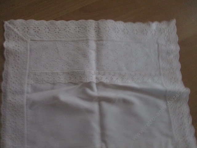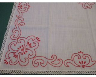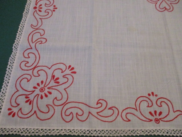 Vyšívaný ubrus, lidový vzor - rozměry: 80x85 cm. Jedná se o červenou výšivku na bílém podkladu. Okraj ubrusu je obháčkován bílou kraječkou. Dva neznatelné flíčky, nálezový stav.