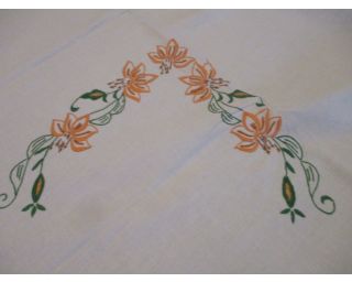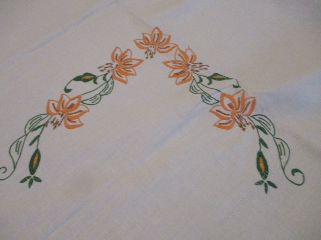 Vyšívaný ubrus s krajkou, velikost: 140x145 cm. Oranžové květy se zelenými listy na bílém plátnu. Po krajích ubrusu bílá 3 cm háčkovaná krajka. Bez poškození.