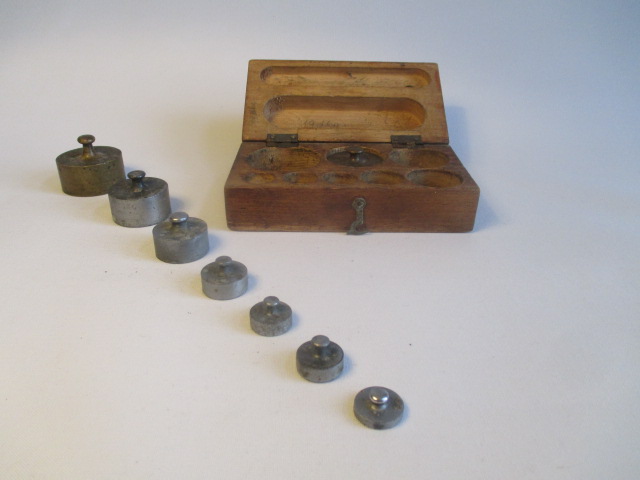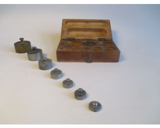 Sada retro závaží v dřevěné krabičce. Závaží od 20 dkg po 0,5 dkg.
