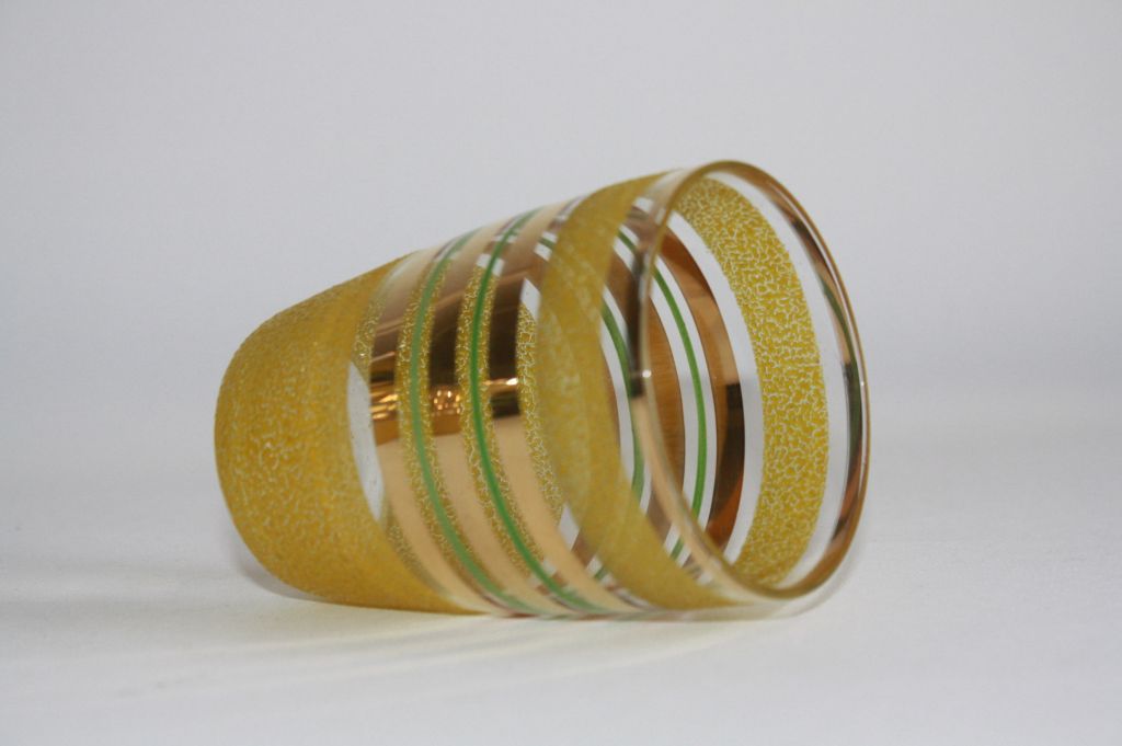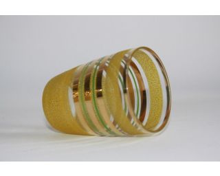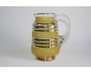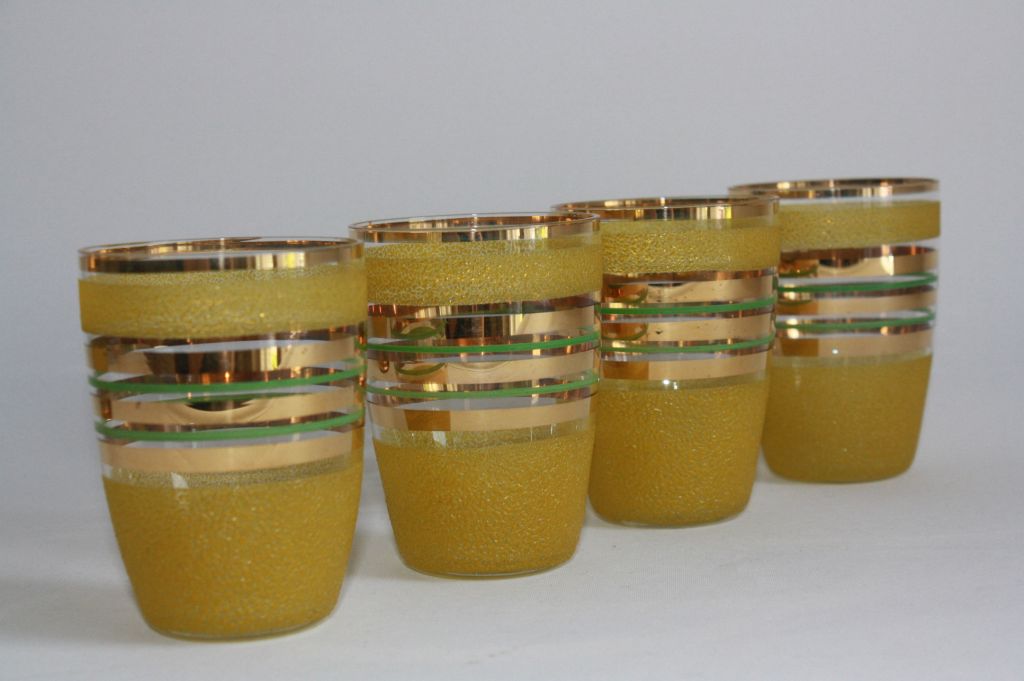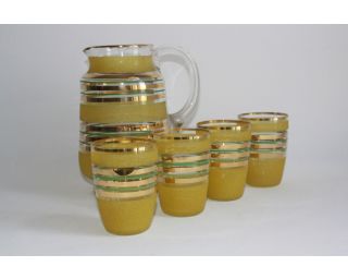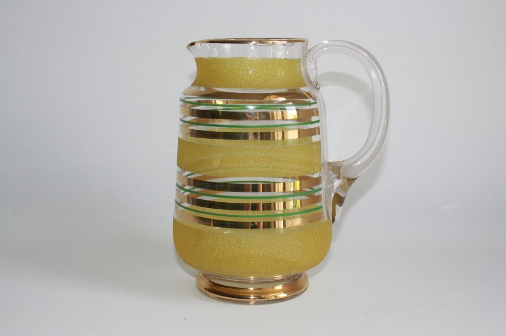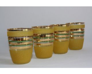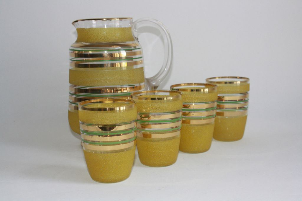 Zlatá sada čtyř skleněných pohárků a džbánu. Zdobeno zlatou barvou.